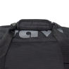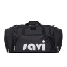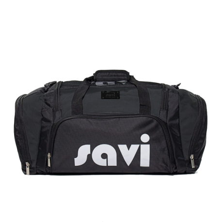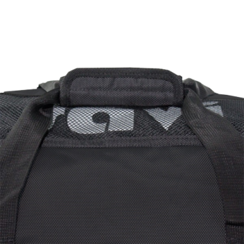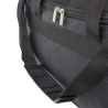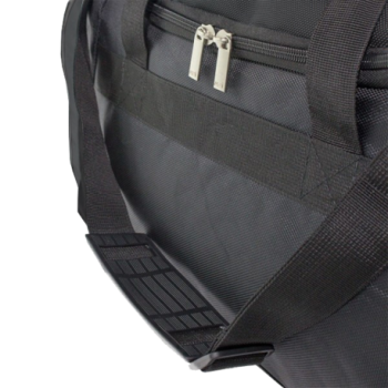 Nylon bag with robust zippers and shoulder strap.